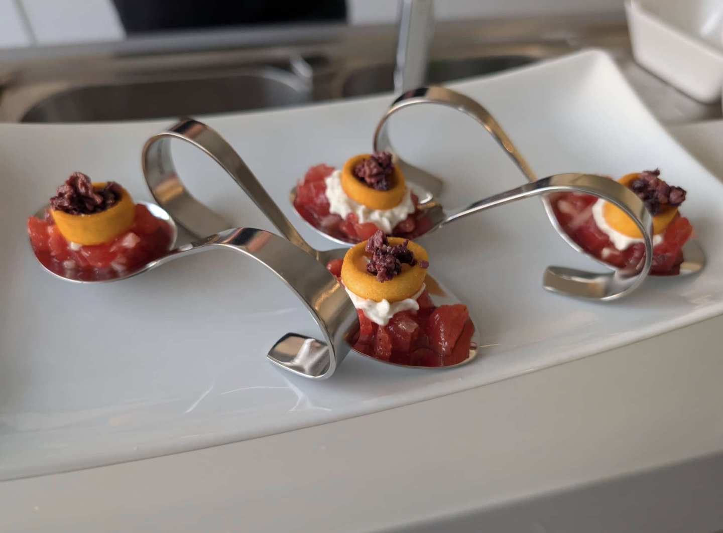 • Gebratene Jakobsmuscheln mit Auberginenmus, Serrano-Chips und Weißweinsauce