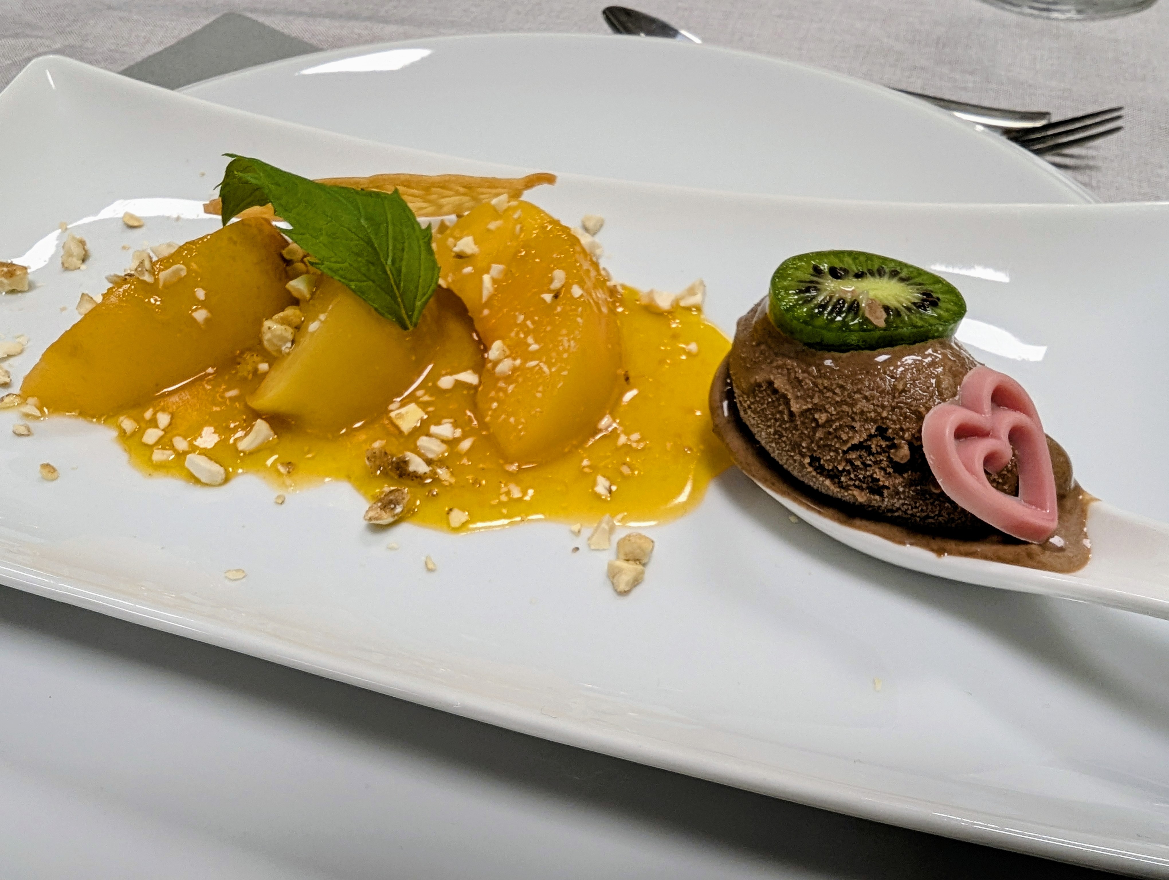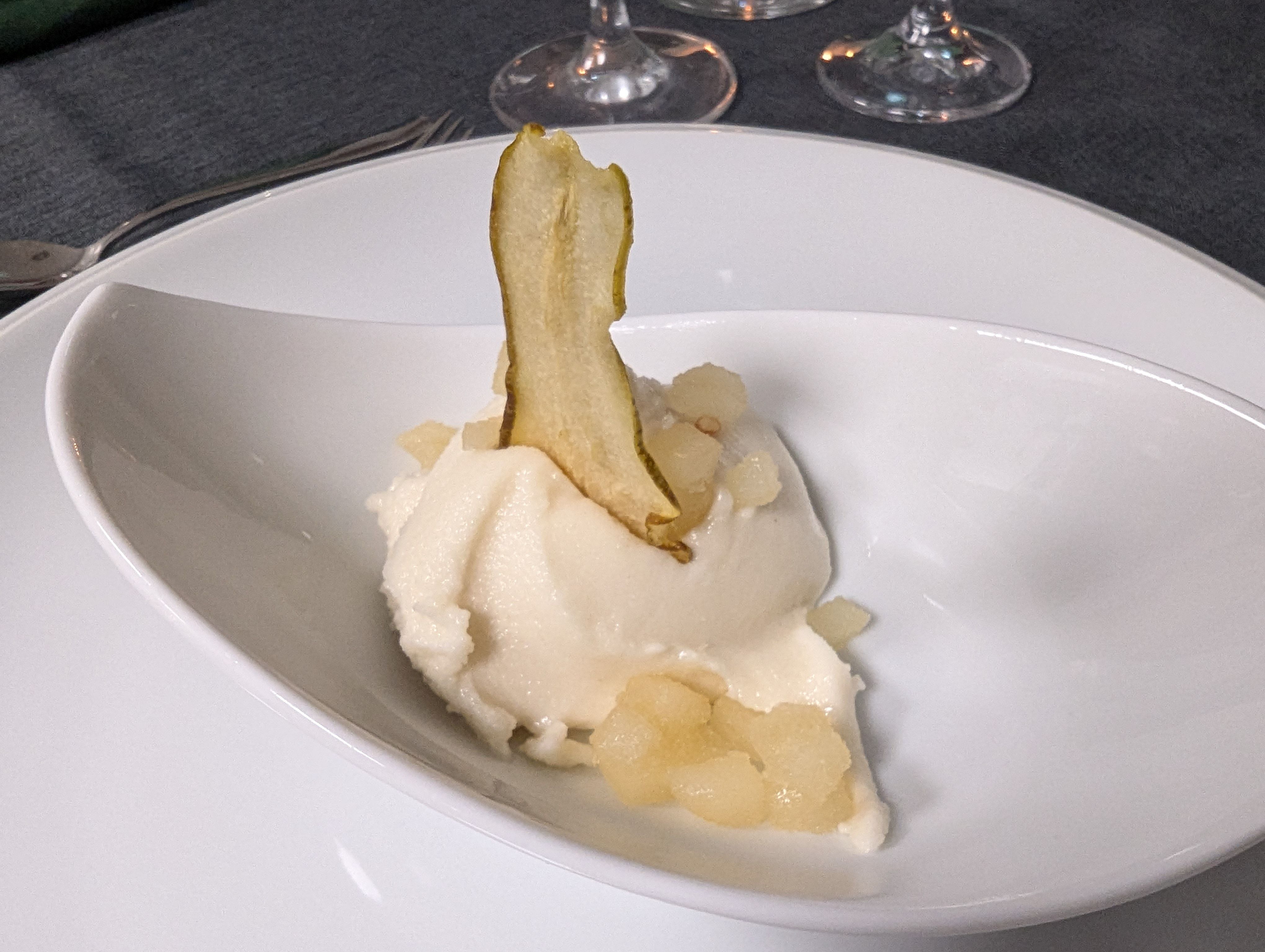• Birnenspalten in Orangen-Karamell und Schokoladeneis