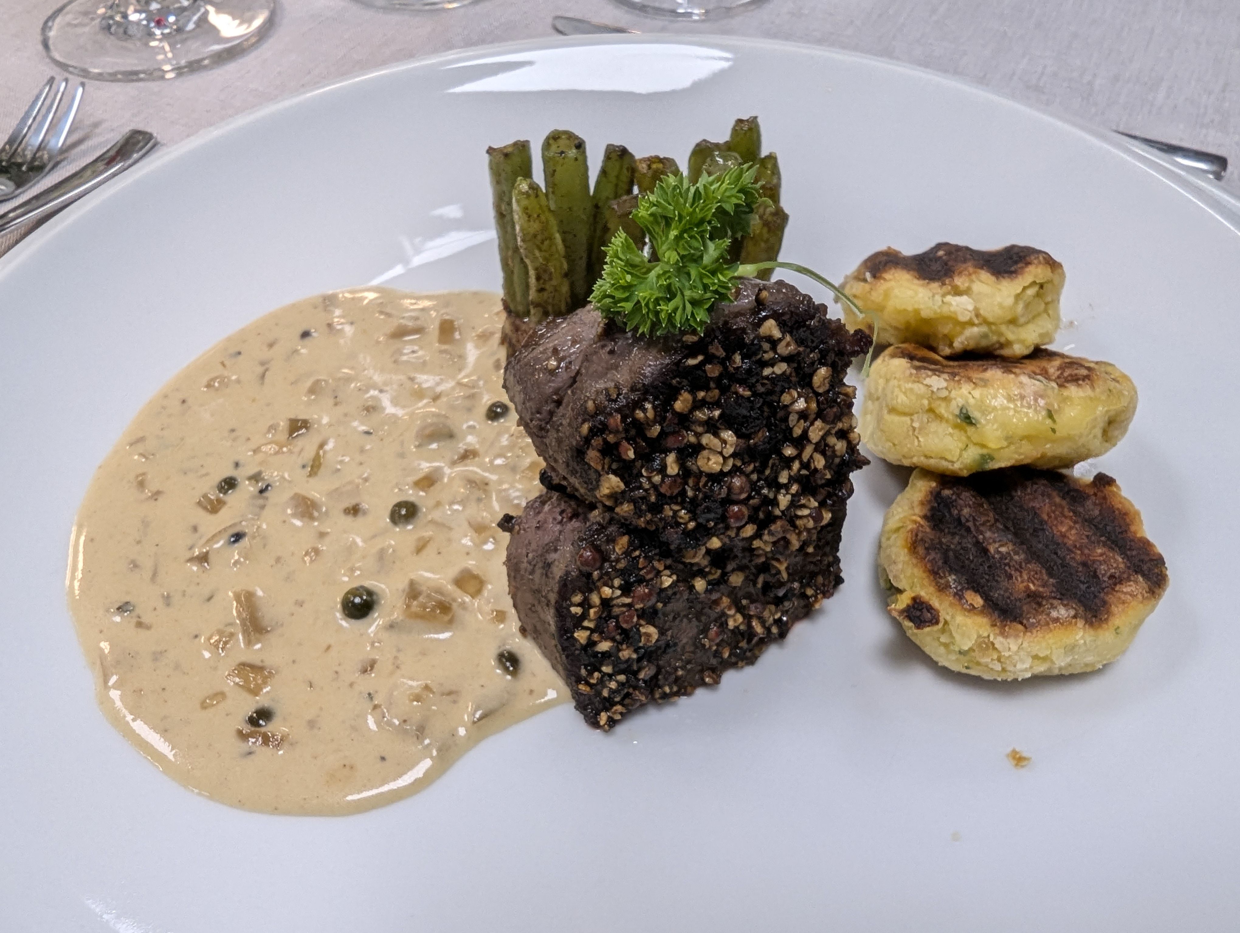 • Pfeffersteak mit Cognacsauce, Speckbohnen und Macaire-Kartoffeln