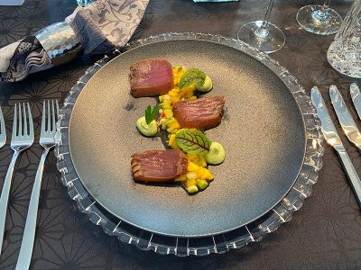 • Thunfisch-Sashimi an Avocado-Creme und Mango-Salat