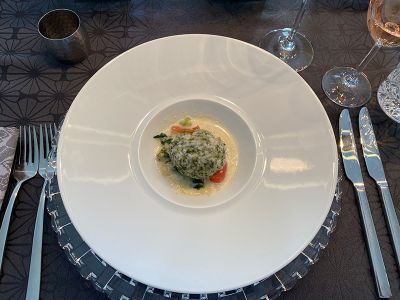 • Parmesanrisotto mit Kräuterpilzen, Kalbsjus und Perlhuhnbrust