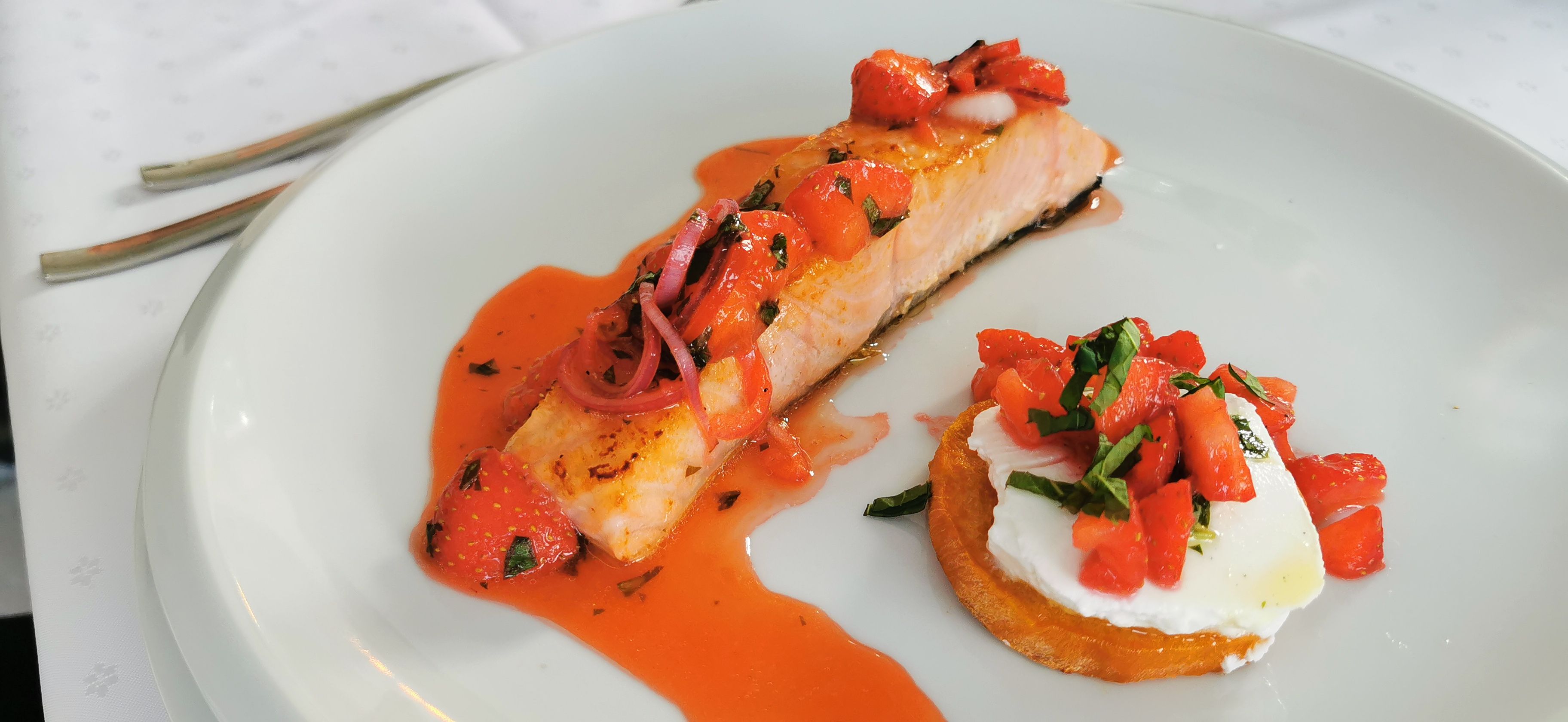 • Lachs mit Erdbeersalsa und Brot von der Süßkartoffel mit Ziegenfrischkäse und Erdbeeren