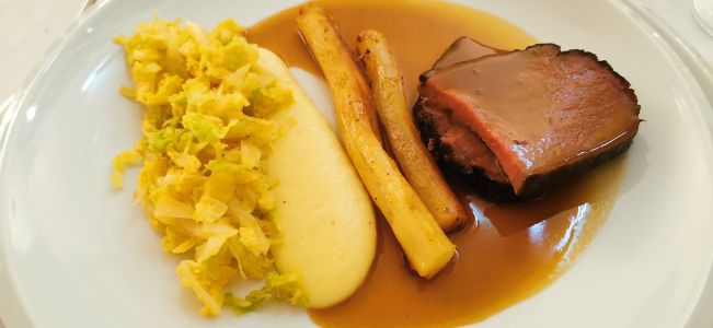 • Dry-Aged Roastbeef mit Schwarzwurzelpüree und Wirsing