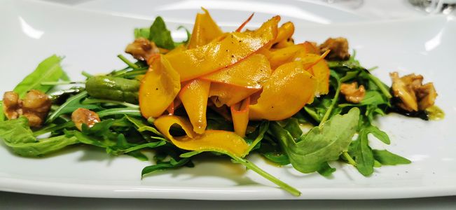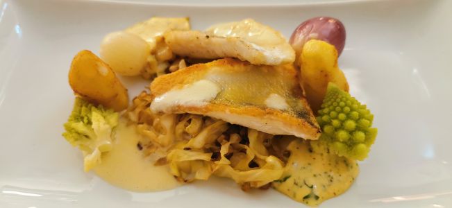 • Zander mit Haselnuss-Spitzkohl, Pfeffer-Romanesco, Kerbel-Emulsion und Beurre Blanc