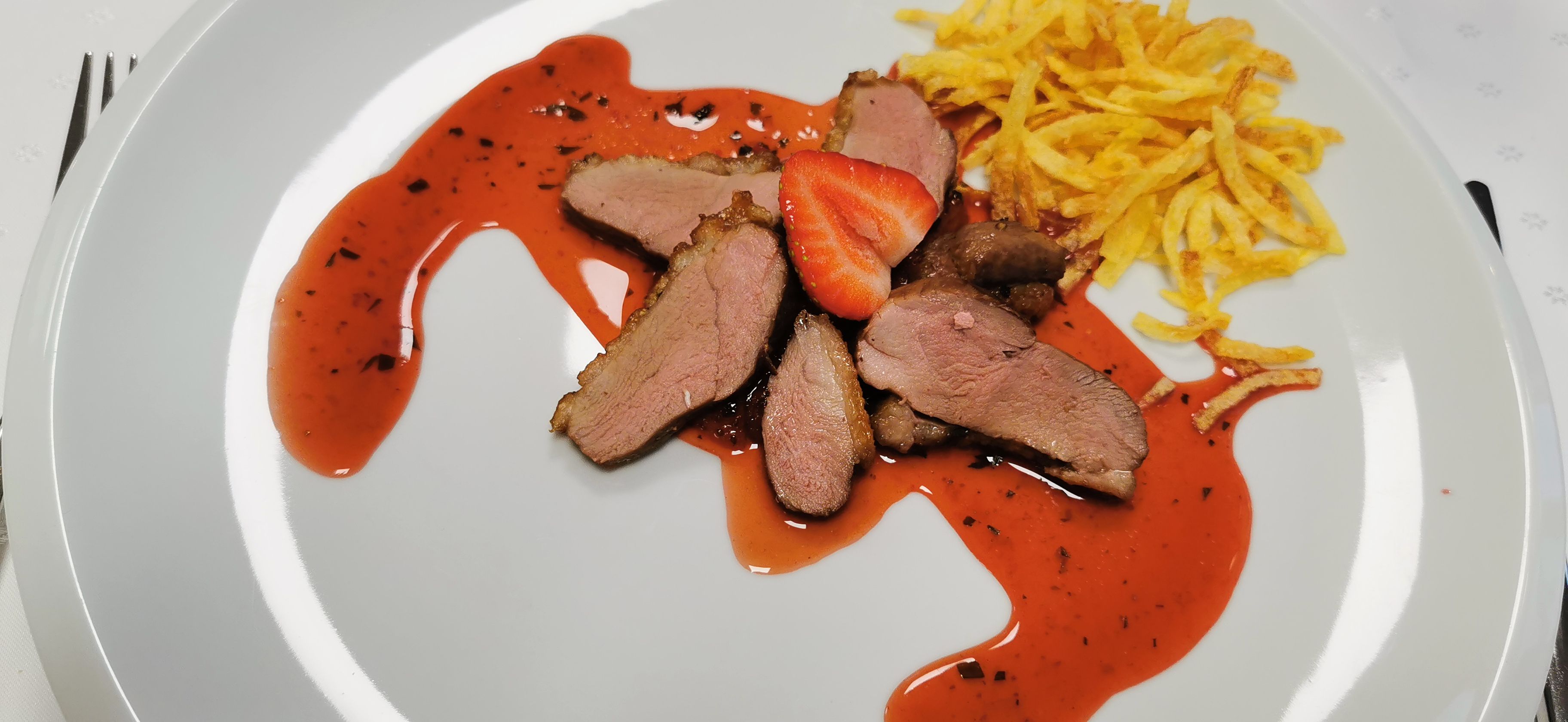 • Tranchen von der Entenbrust auf Erdbeercarpaccio und Kartoffelstroh