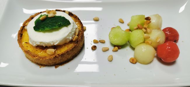 • Limoncello-Tarte mit Melonensalat und Joghurteis
