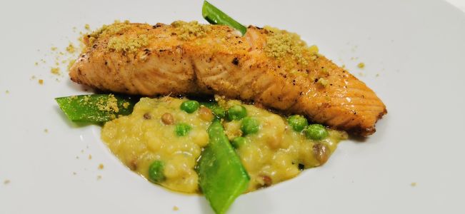 • Fregola sarda mit Lachsforelle und Erbsen