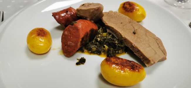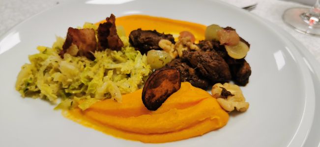• Rehragout in Barolo mit Walnüssen, Trauben und Speck, Süßkartoffelpüree und Wirsinggemüse