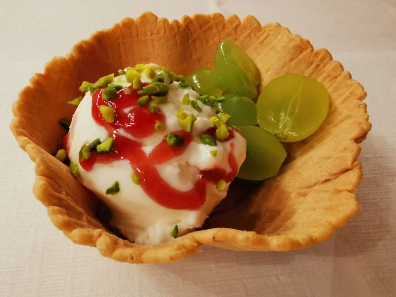 Am zweiten Tag haben wir „Joghurtsemifredo il grappa die uva“ angeboten. Unser erfrischendes Joghurteis mit Grappa-Trauben, roter Traubensauce und Pistazien-Crunch hatten wir dazu im Waffelschälchen angerichtet. Bei Temperaturen von tagsüber bis zu 34°C war dieses Dessert eine willkommene Erfrischung. Auch wenn viele Gäste und Teilnehmer bereits von den hervorragenden Vorspeisen und Hauptgerichten gesättigt waren, konnten wir das ein oder andere Lächeln auf deren Gesichter zaubern.