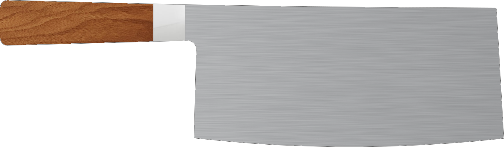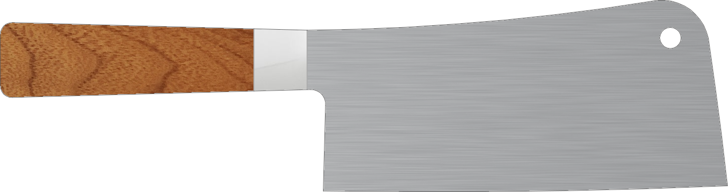 Rechteckige Klinge mit stumpfem Rücken und scharfem Schliff. Zum Zerteilen von Fleisch. Quer gehalten auch als Plattiereisen nutzbar.