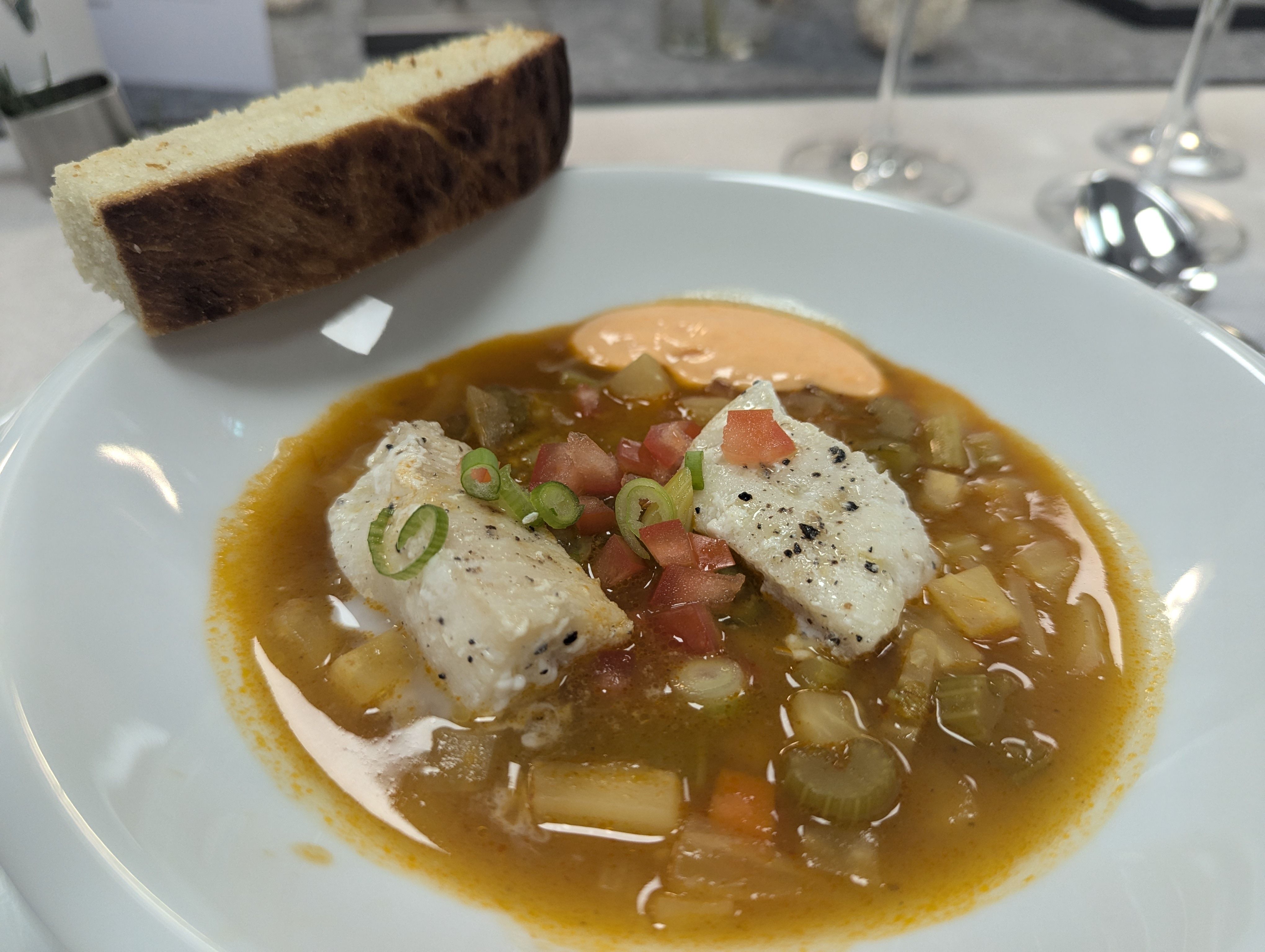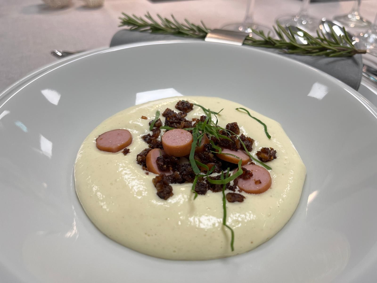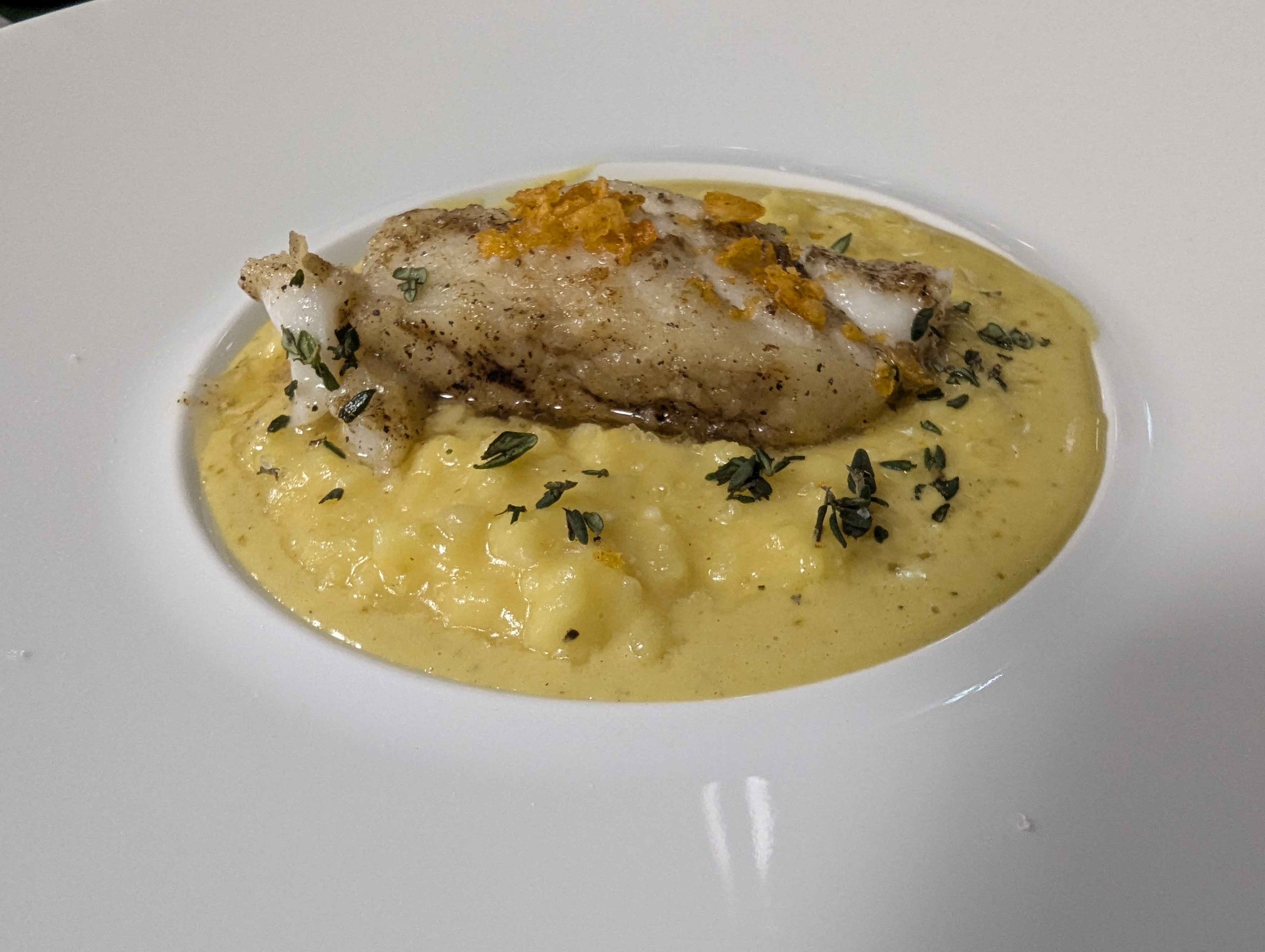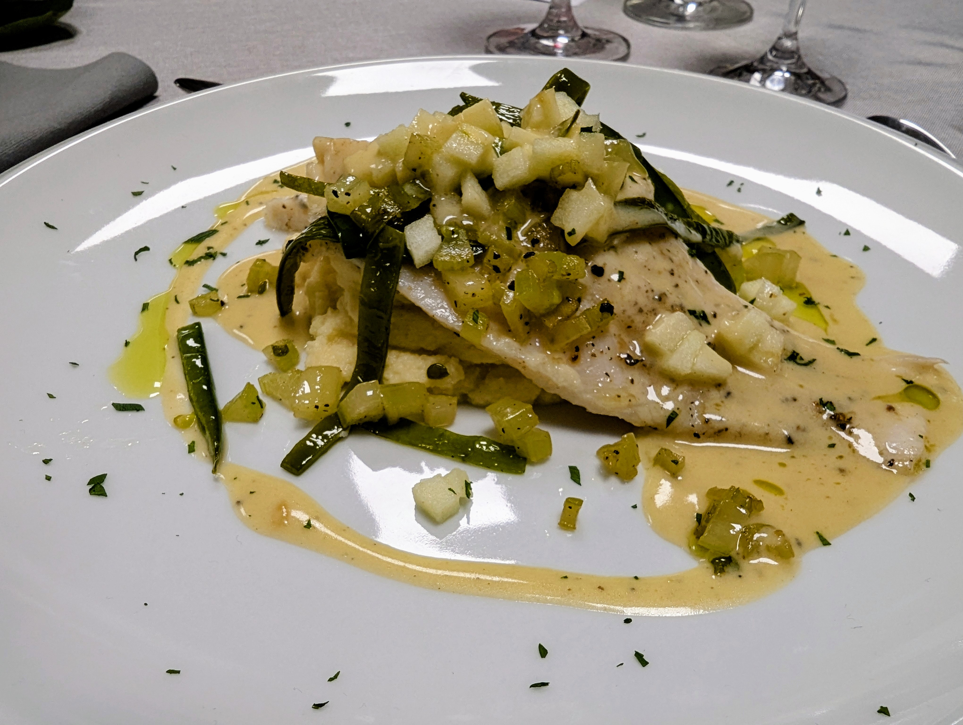 • Konfierter Saibling im Buttermilch-Sud mit gebratenem Gemüse, Selleriepüree und Estragon-Öl