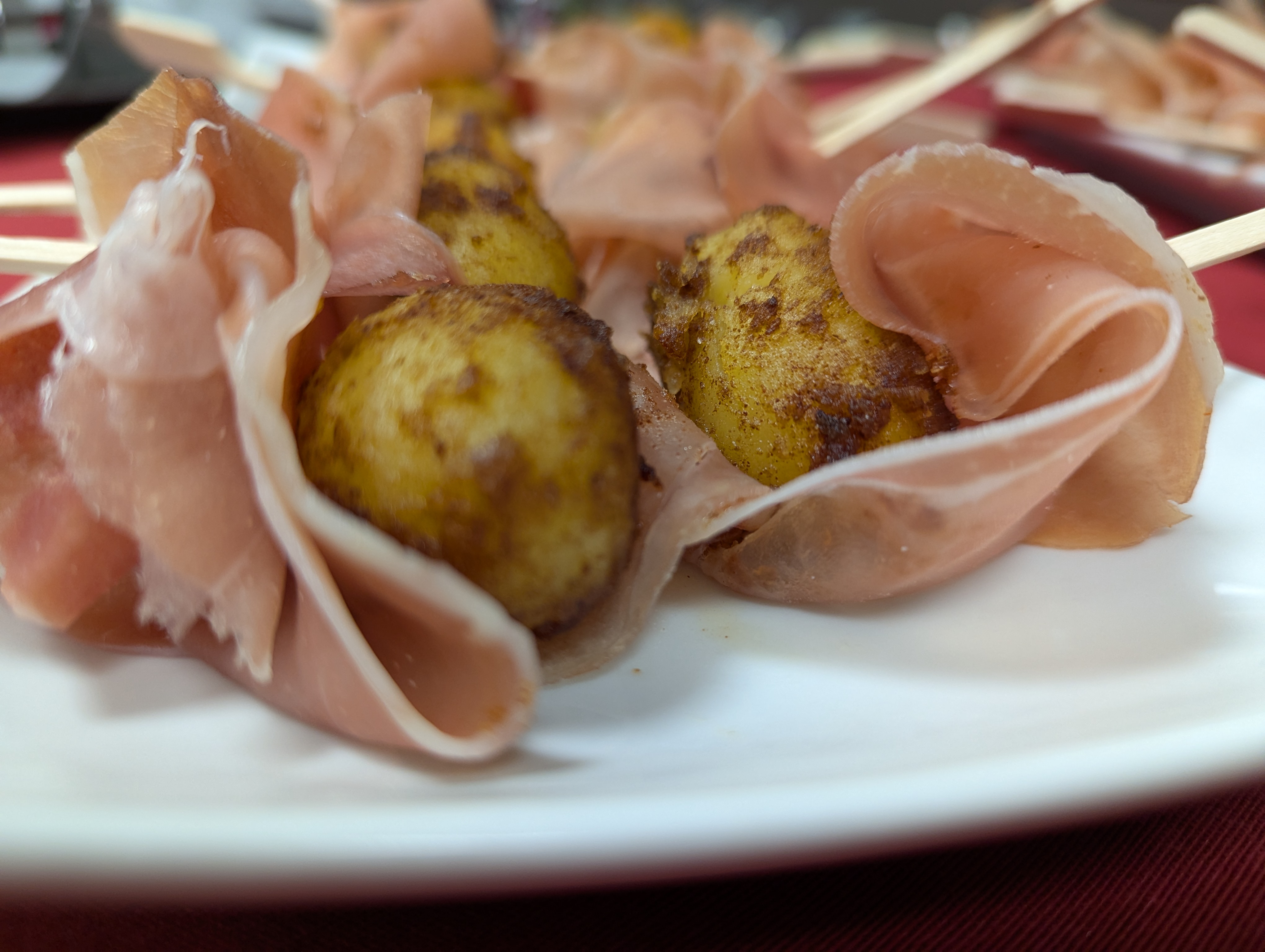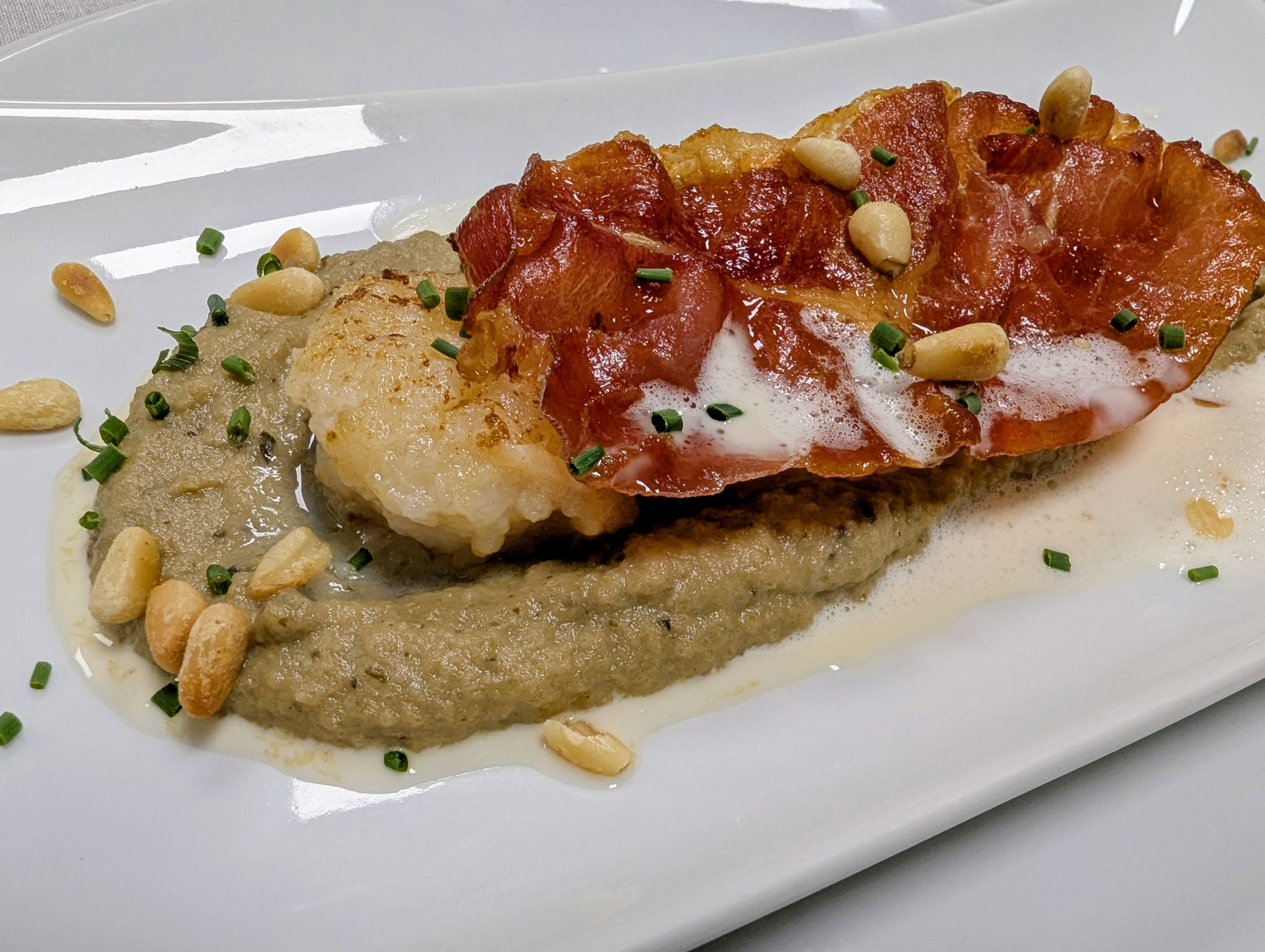 • Gebratene Jakobsmuscheln mit Auberginenmus, Serrano-Chips und Weißweinsauce