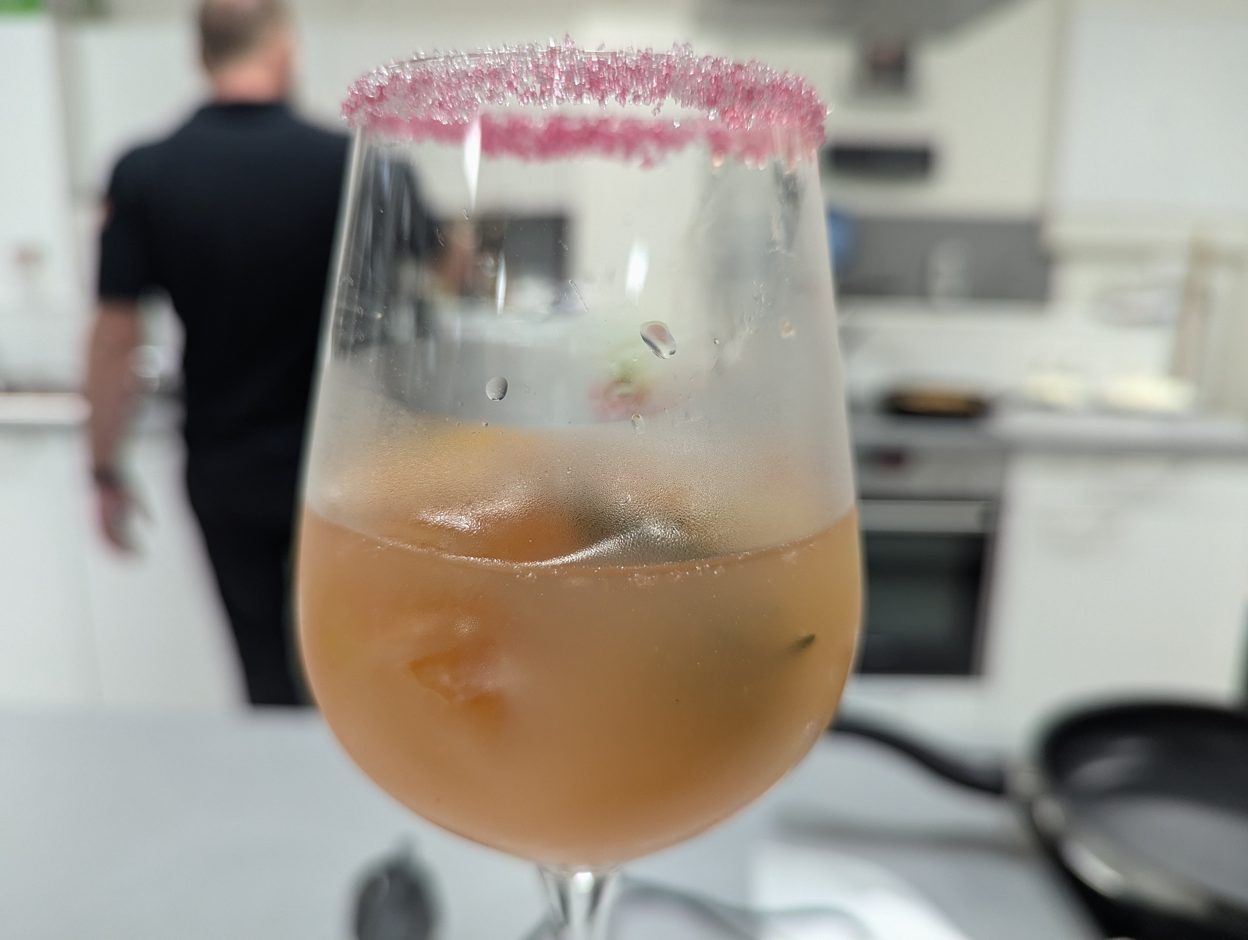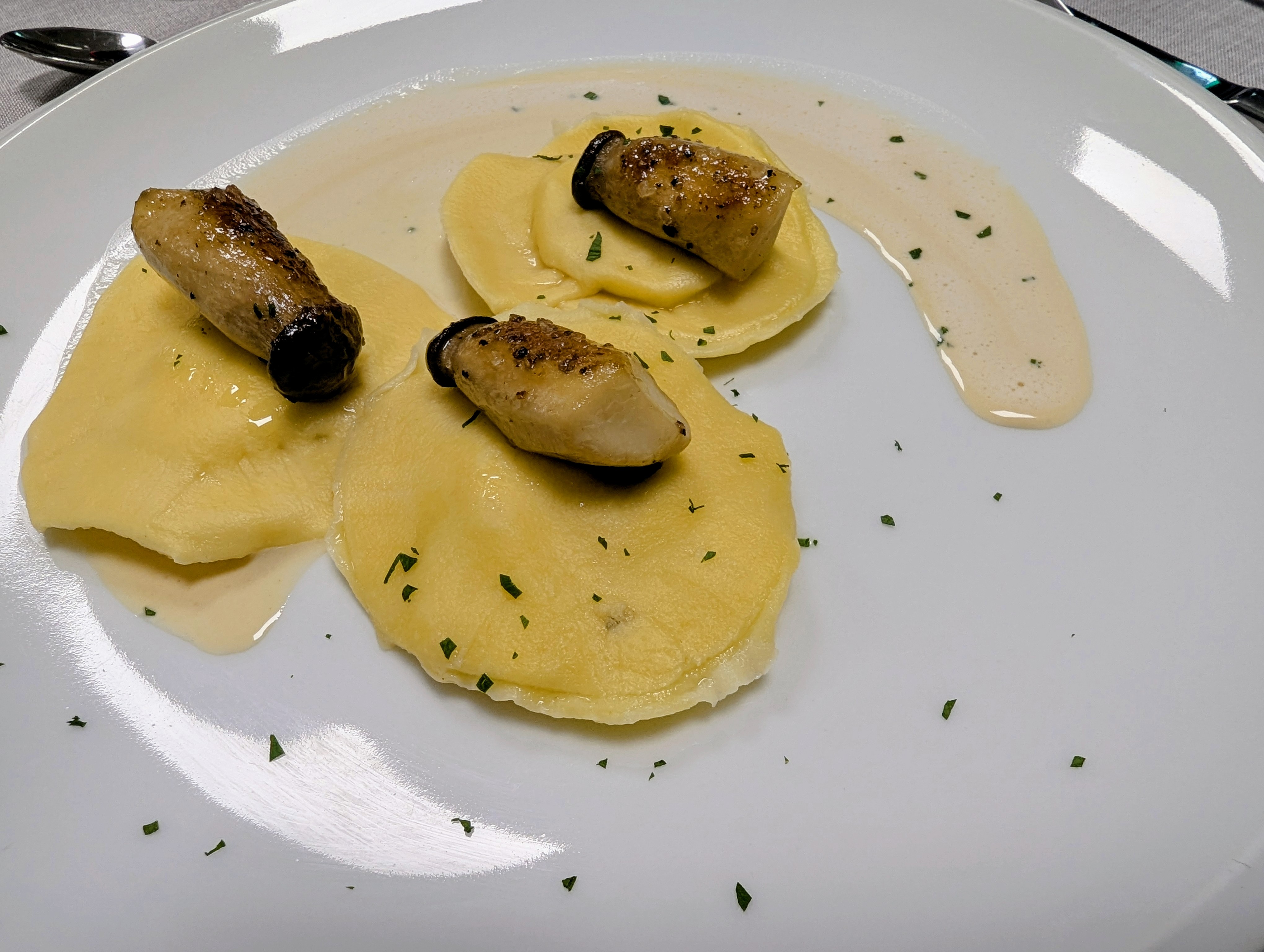 • Ravioli mit Frischkäse-Serrano-Füllung, Zitronenschaum und Kräuterseitlingen