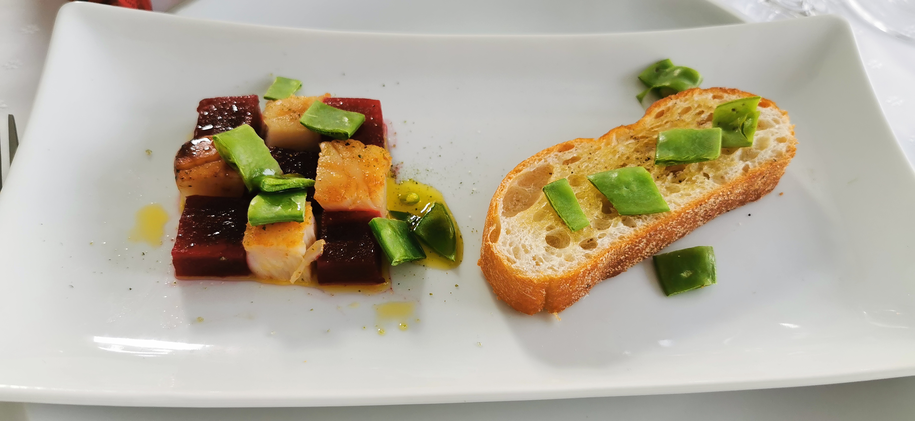 • Zander mit Haselnuss-Spitzkohl, Pfeffer-Romanesco, Kerbel-Emulsion und Beurre Blanc