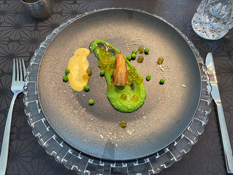 • Gebackene Teriyaki-Garnele mit Yuzu-Hollandaise und Erbsenpüree