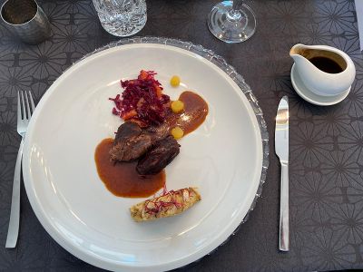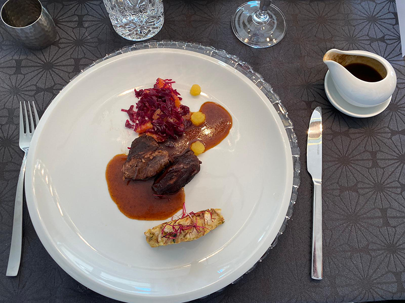 • Kalbsbäckchen mit Orangenrotkohl und gebratene Brezel-Serviettenknödel