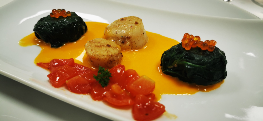 • Spinat - Lachs - Päckchen mit Jakobsmuschel und Safransauce