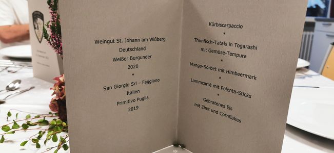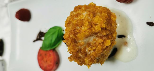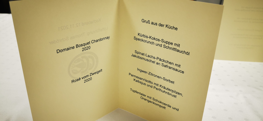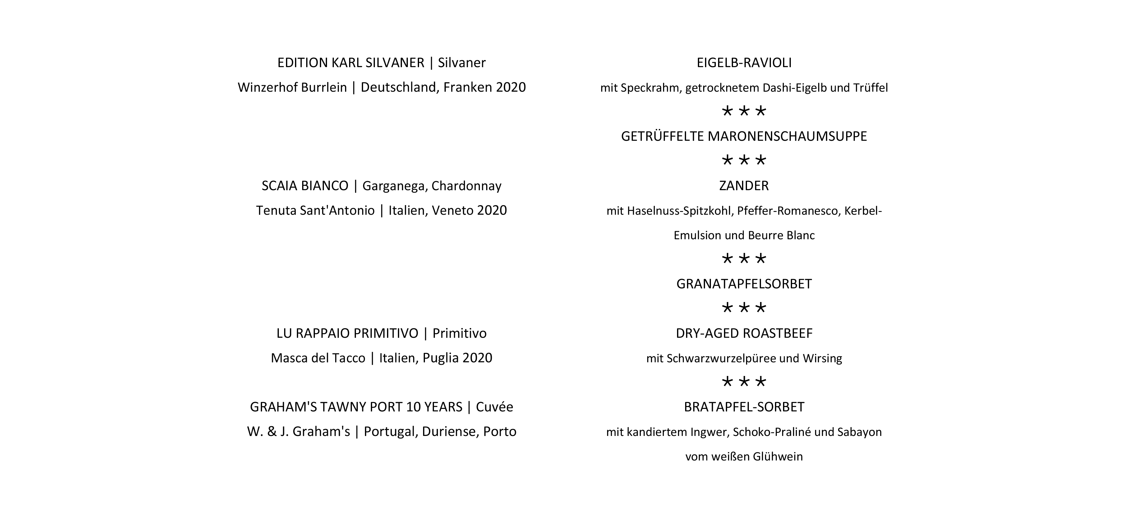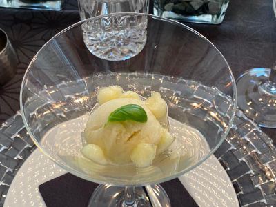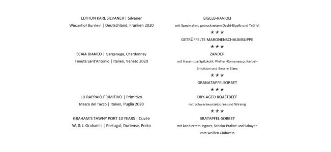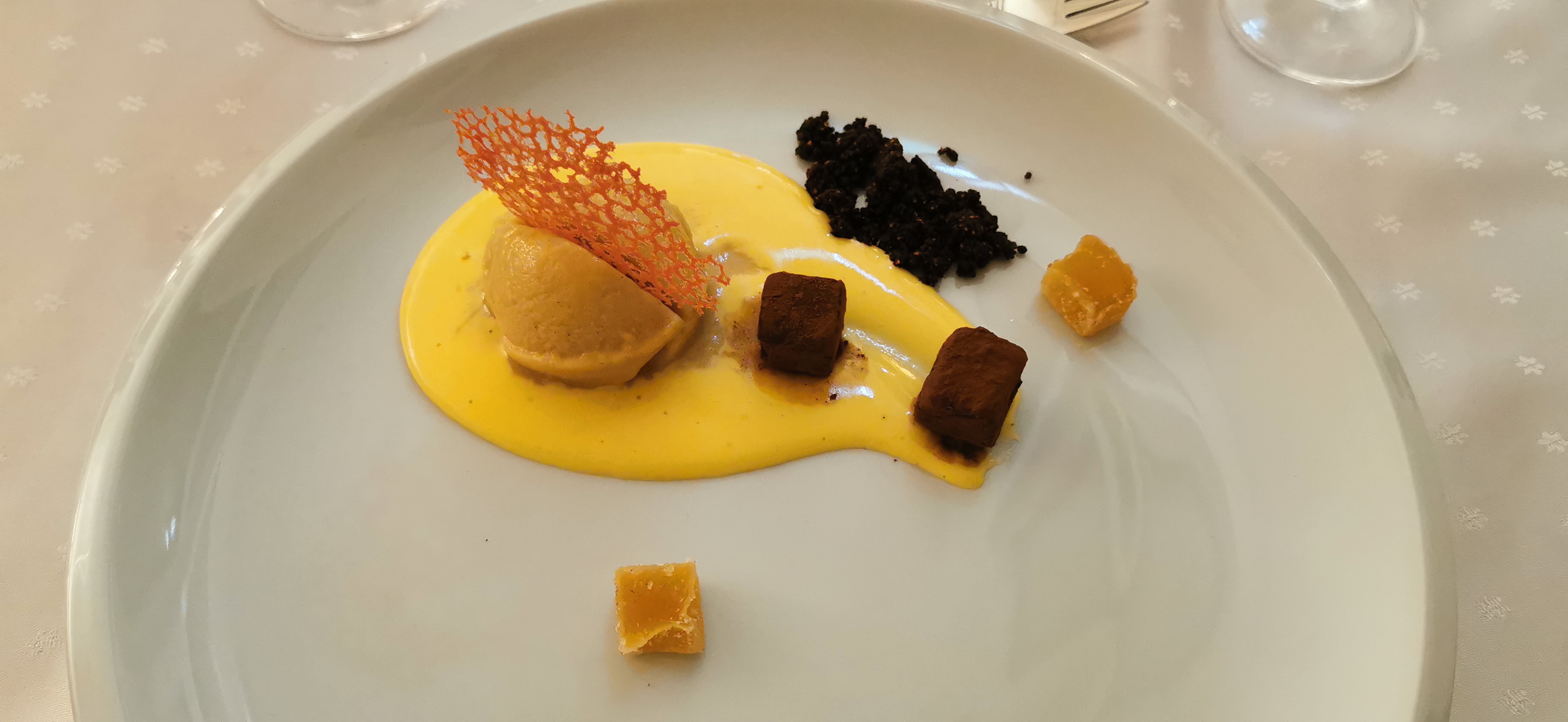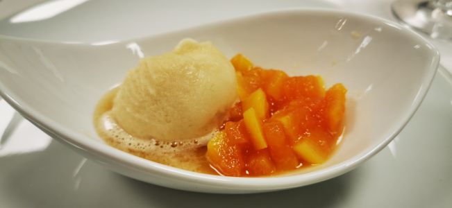 • Bratapfel-Sorbet mit kandiertem Ingwer, Schoko-Praliné und Sabayon vom weißen Glühwein