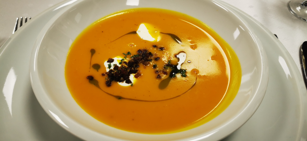 • Kürbis-Kokos-Suppe mit Speckcrunch und Schnittlauchöl