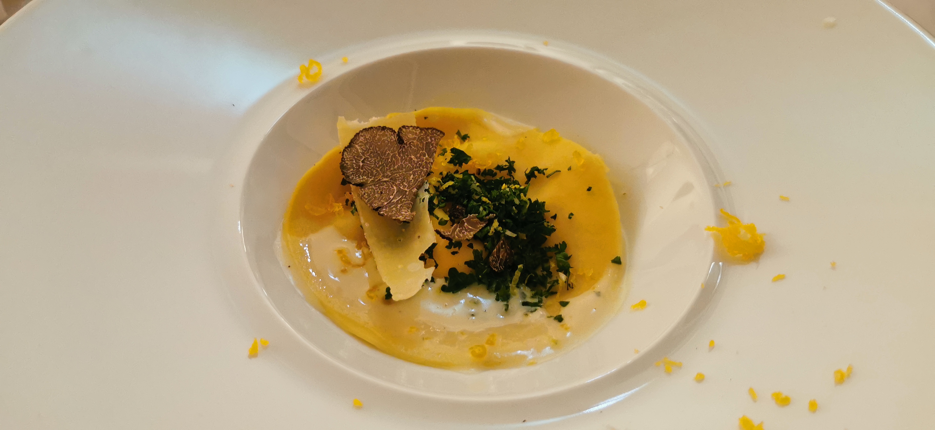 • Eigelb-Raviolo mit Speckrahm, getrocknetem Dashi-Eigelb und Trüffel