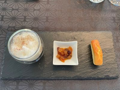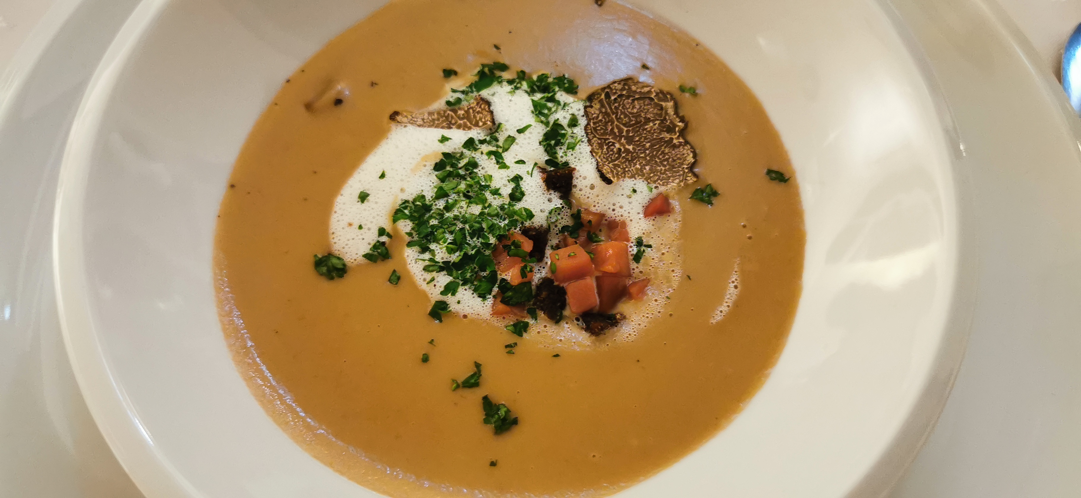 • Sellerie-Birnen-Suppe mit Cappuccino-Milchschaum und Brioche