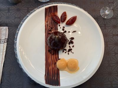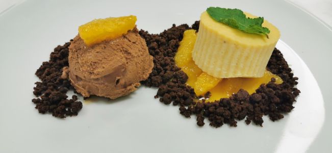 • Topfentaler mit Schokoladenmouse, Schokoerde und Orangenkompott