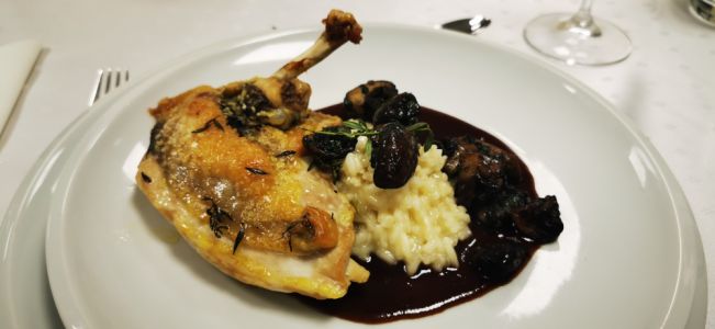 • Parmesanrisotto mit Kräuterpilzen, Kalbsjus und Perlhuhnbrust