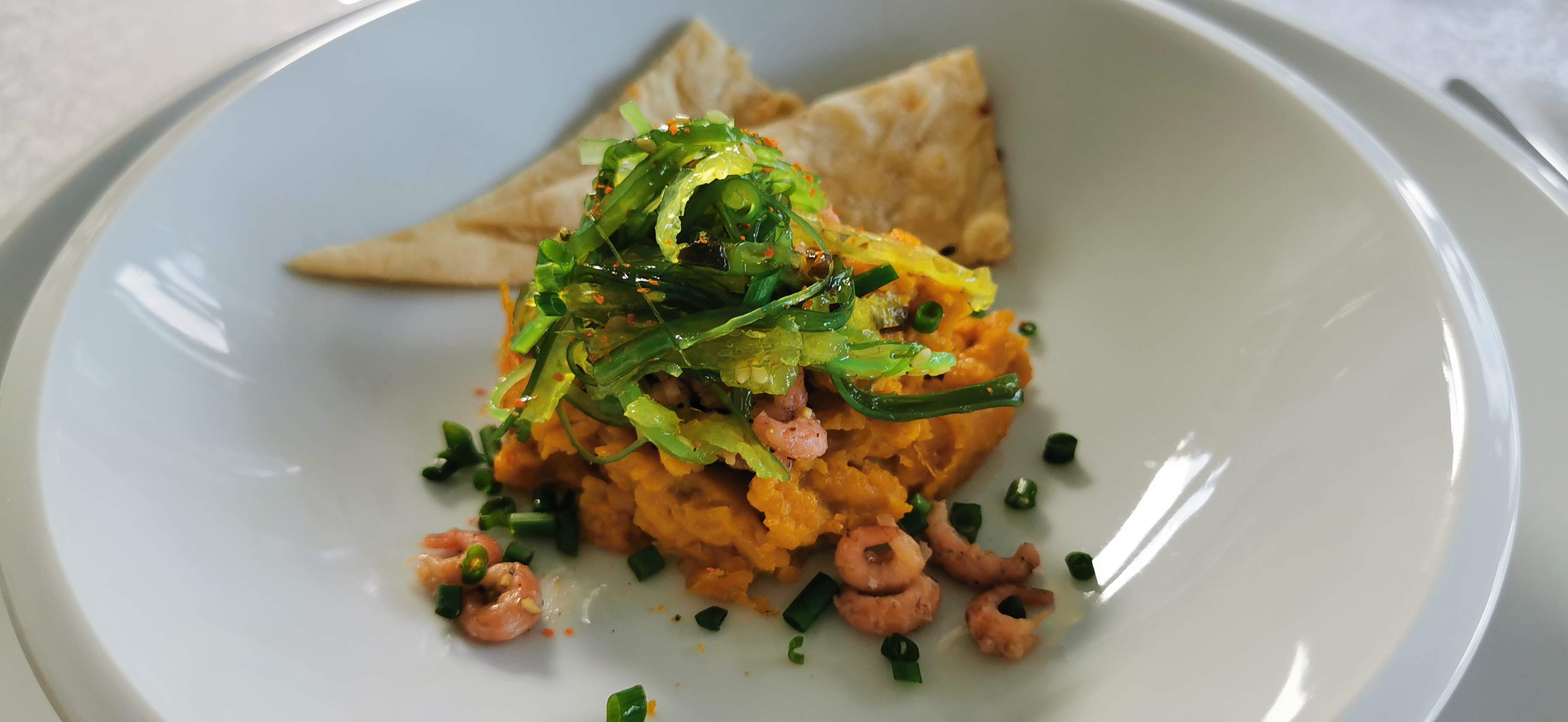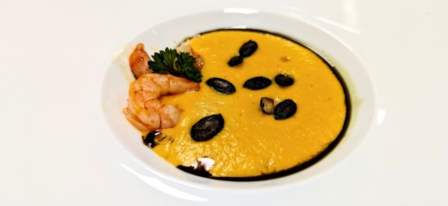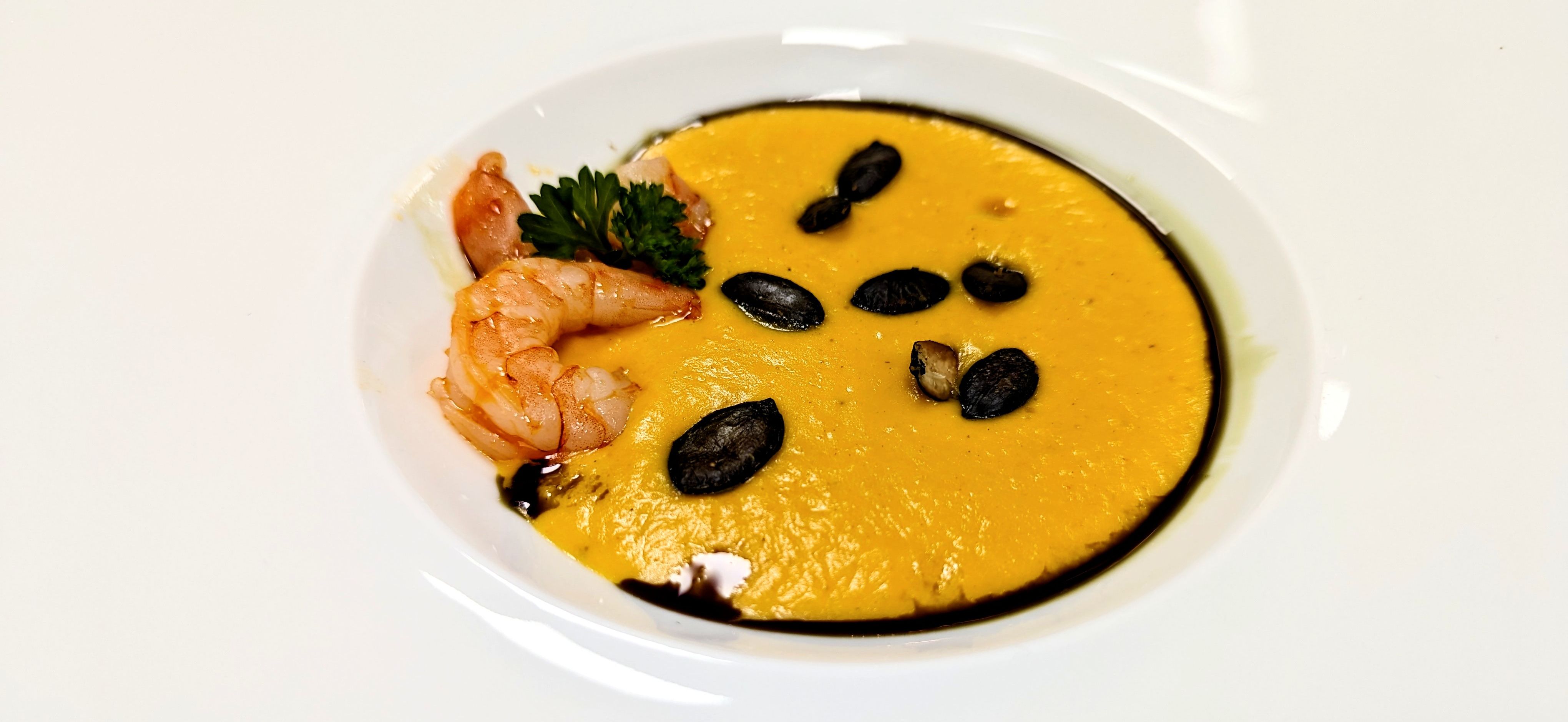 • Suppe aus Kürbis, Süßkartoffel und Ingwer mit gerösteten Kürbiskernen und Chili-Scampi