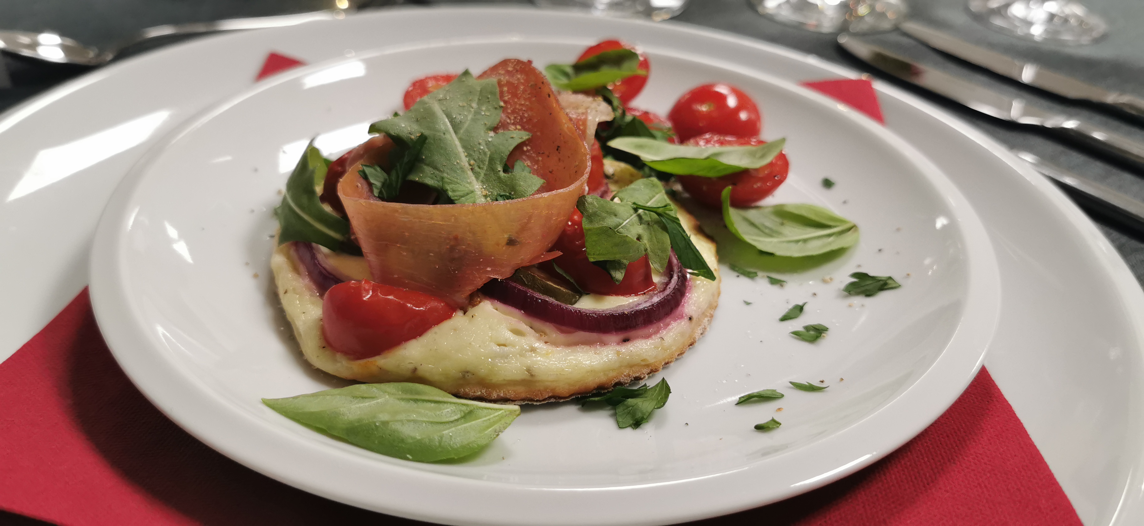 • Flammküchlein mit Kirschtomaten, Kapernäpfeln und Serranoschinken