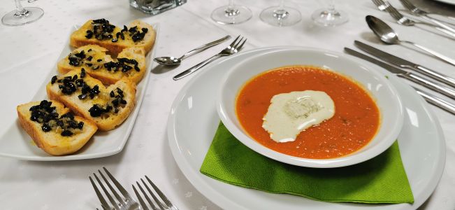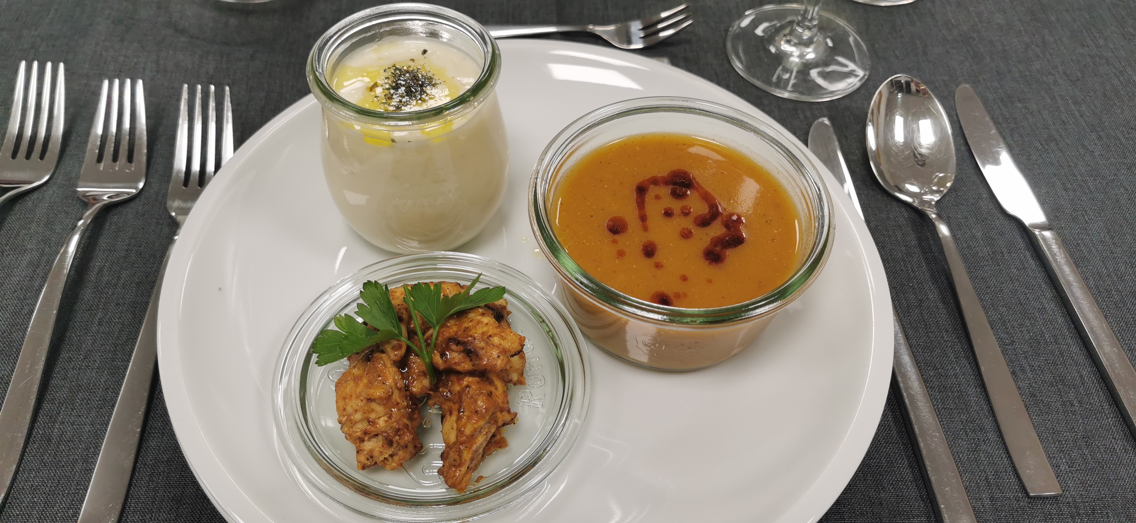 • Zweierlei Suppe und Hähnchenbrust