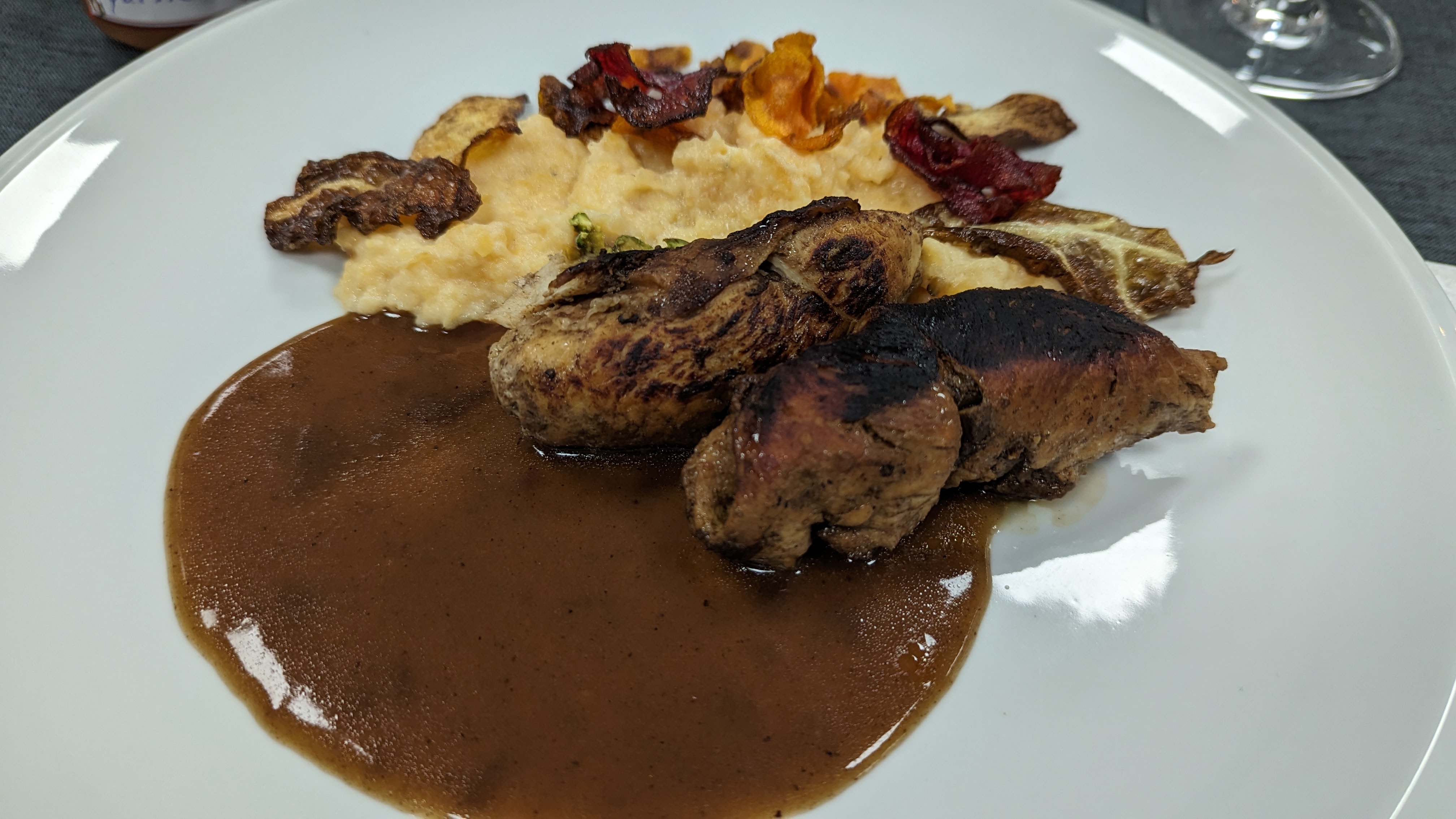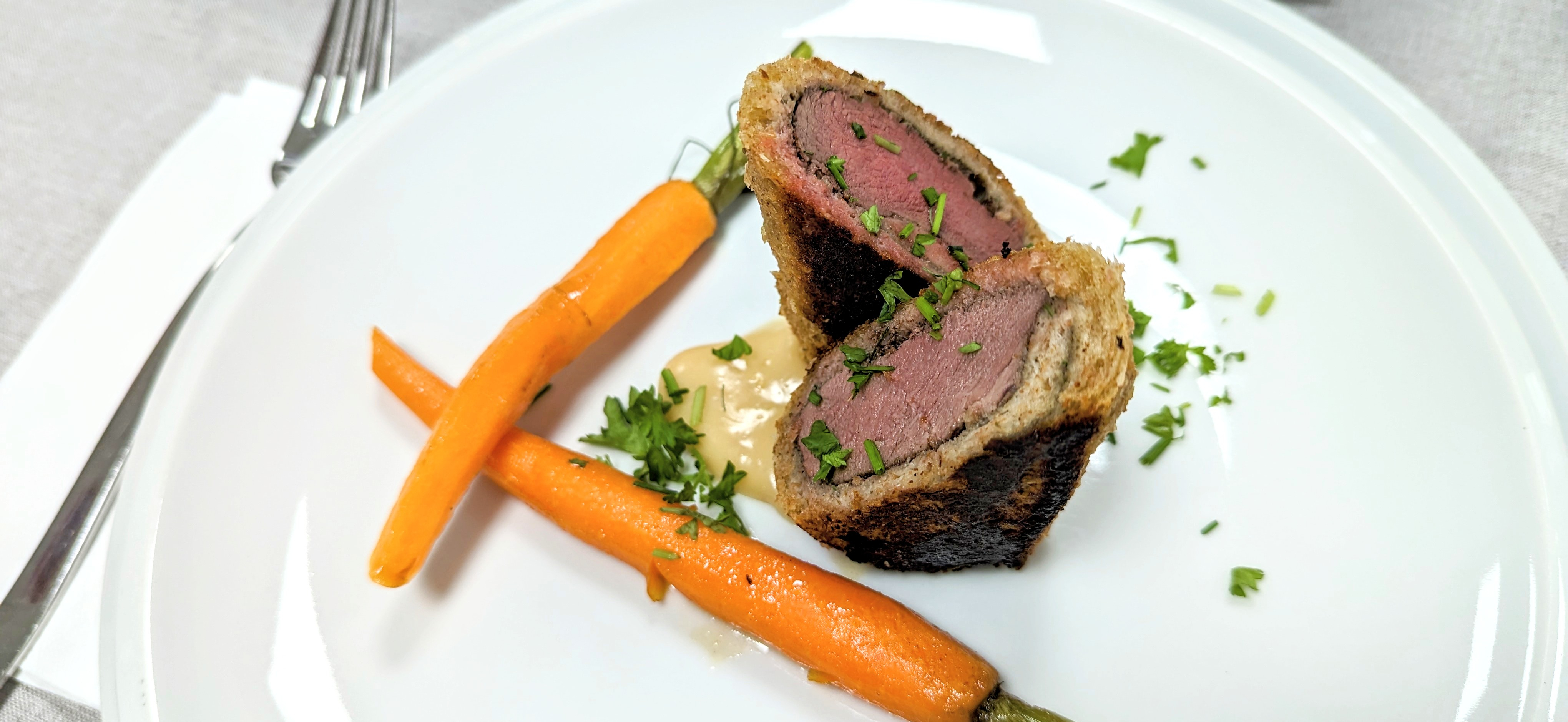 • Rehrücken im Tramezzinimantel auf weißer Schokoladen-Chili- Sauce mit karamellisierten Möhren