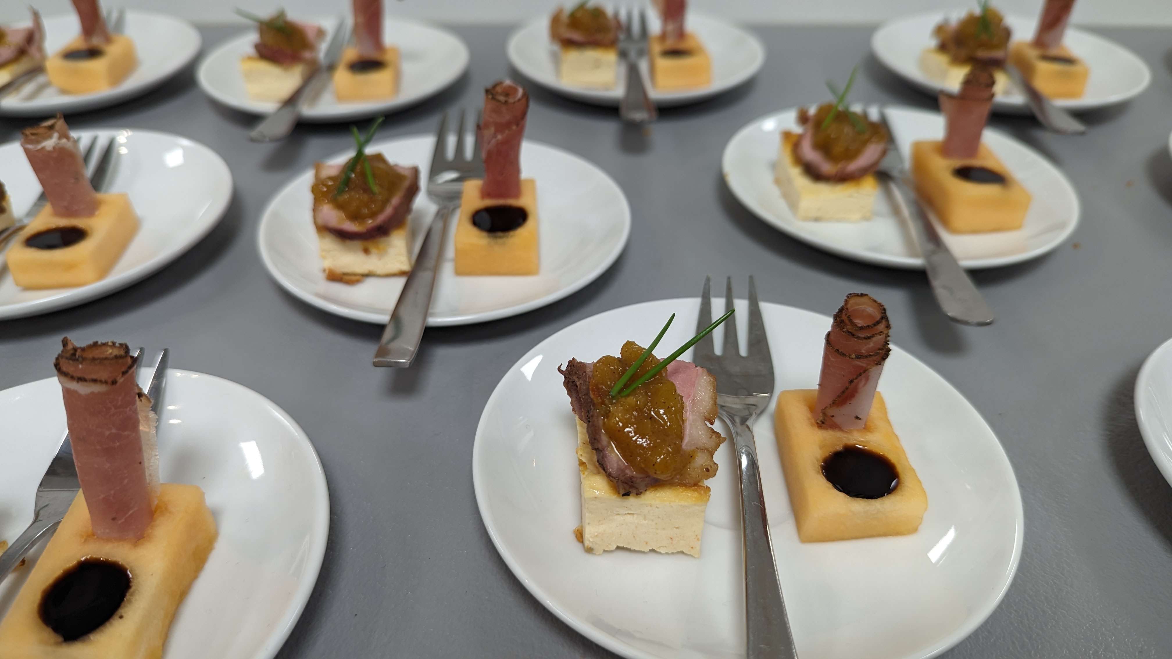 • Käsekuchen mit Ente & Prosciutto Praline