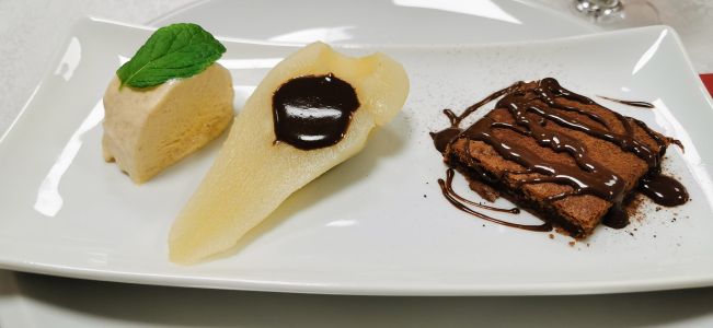 • Bananen -Brownies Brownies dazu Zimteis mit Birne und Lebkuchensoße