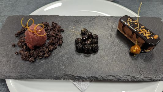 • Nuss-Karamellstreifen mit Pflaumensorbet