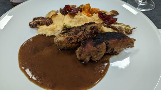 • Rehragout in Barolo mit Walnüssen, Trauben und Speck, Süßkartoffelpüree und Wirsinggemüse