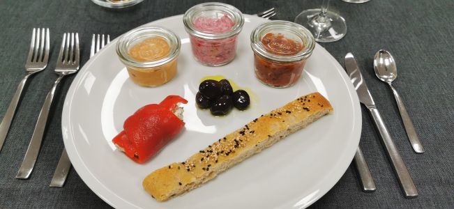 • Dreierlei Dips, Oliven, gefüllte Paprika und Fladenbrot