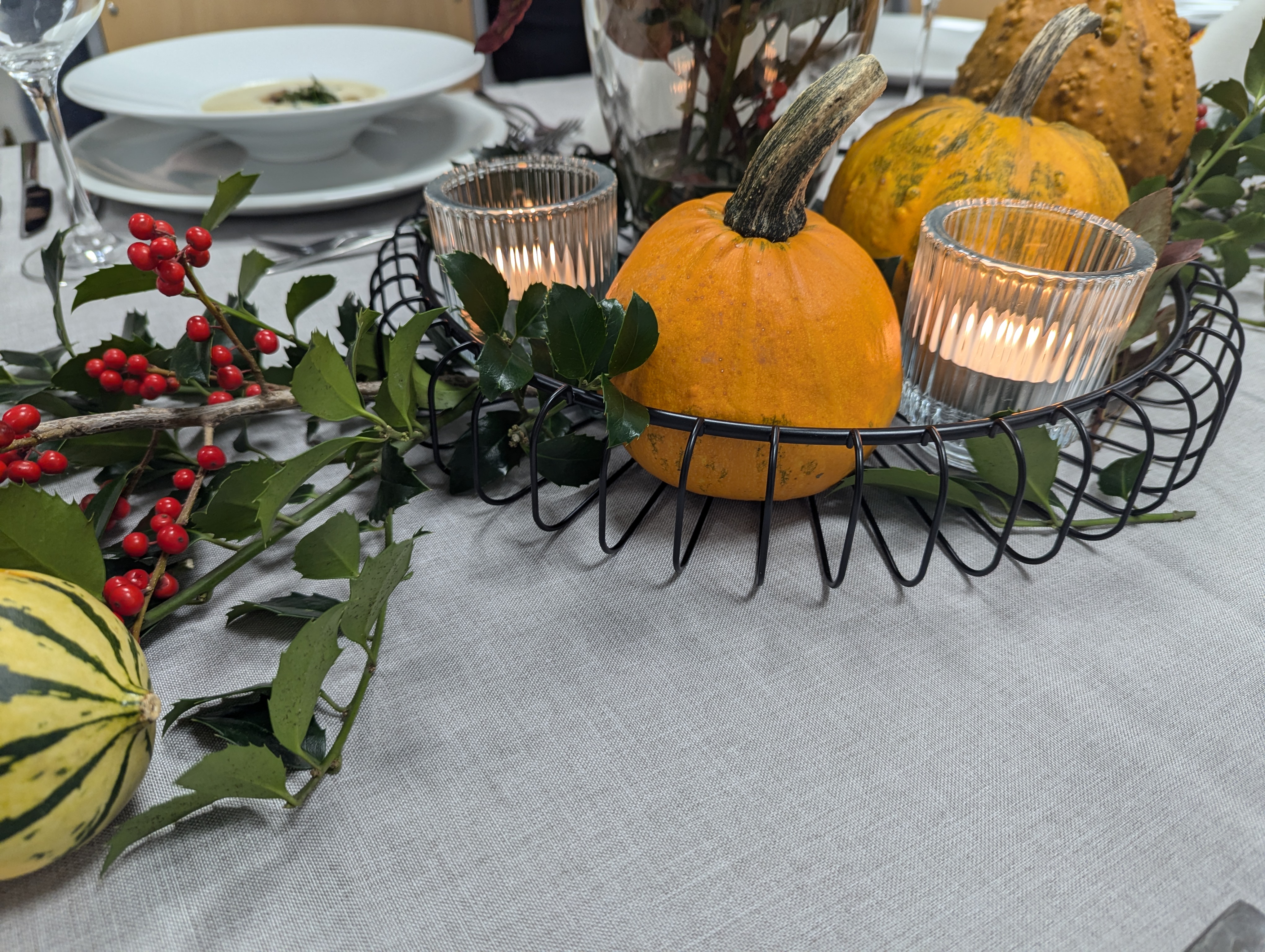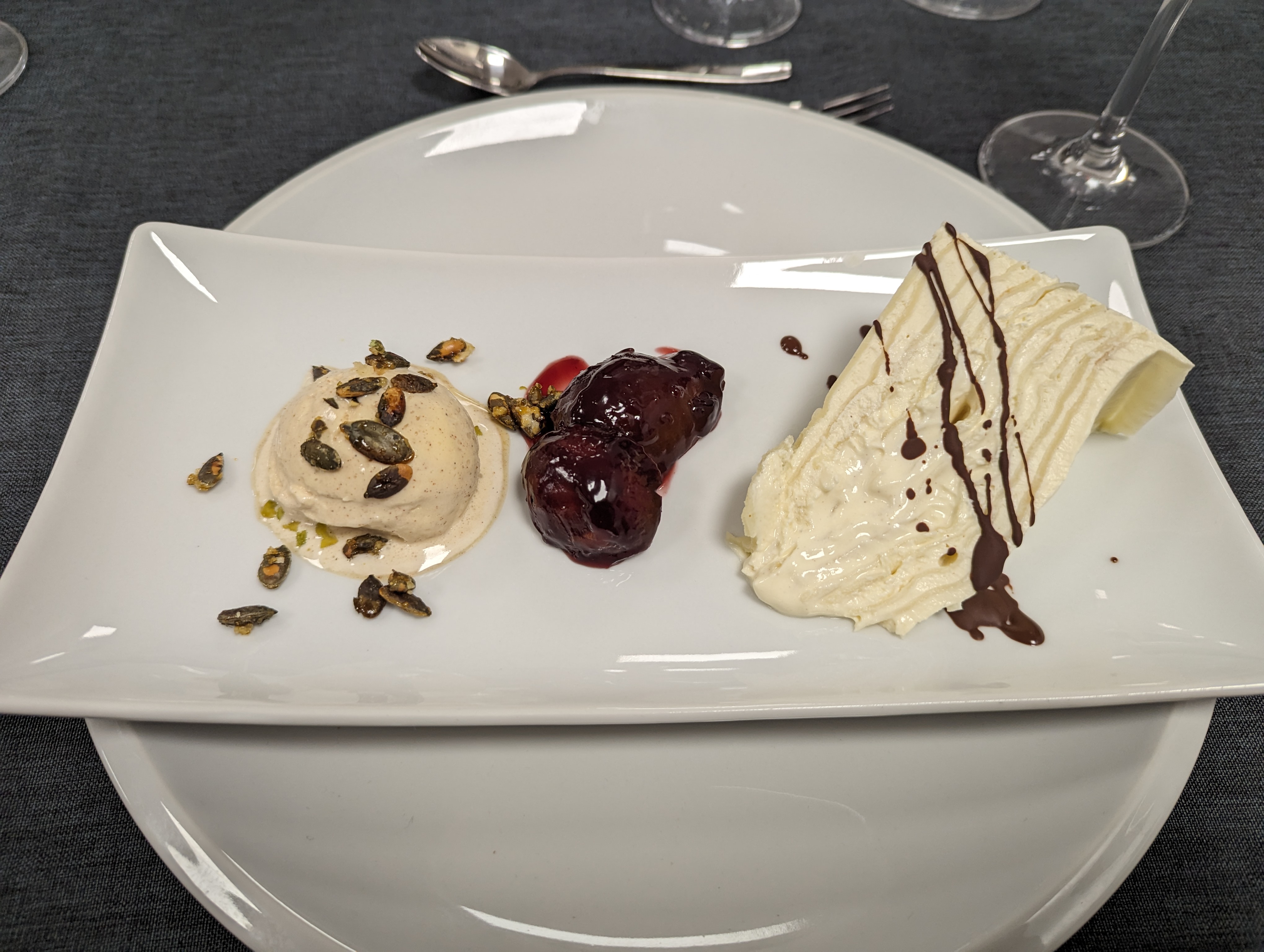 • Winterliche Creptorte mit karamellisierten Kürbiskernen, Zimteis und Pflaumenröster