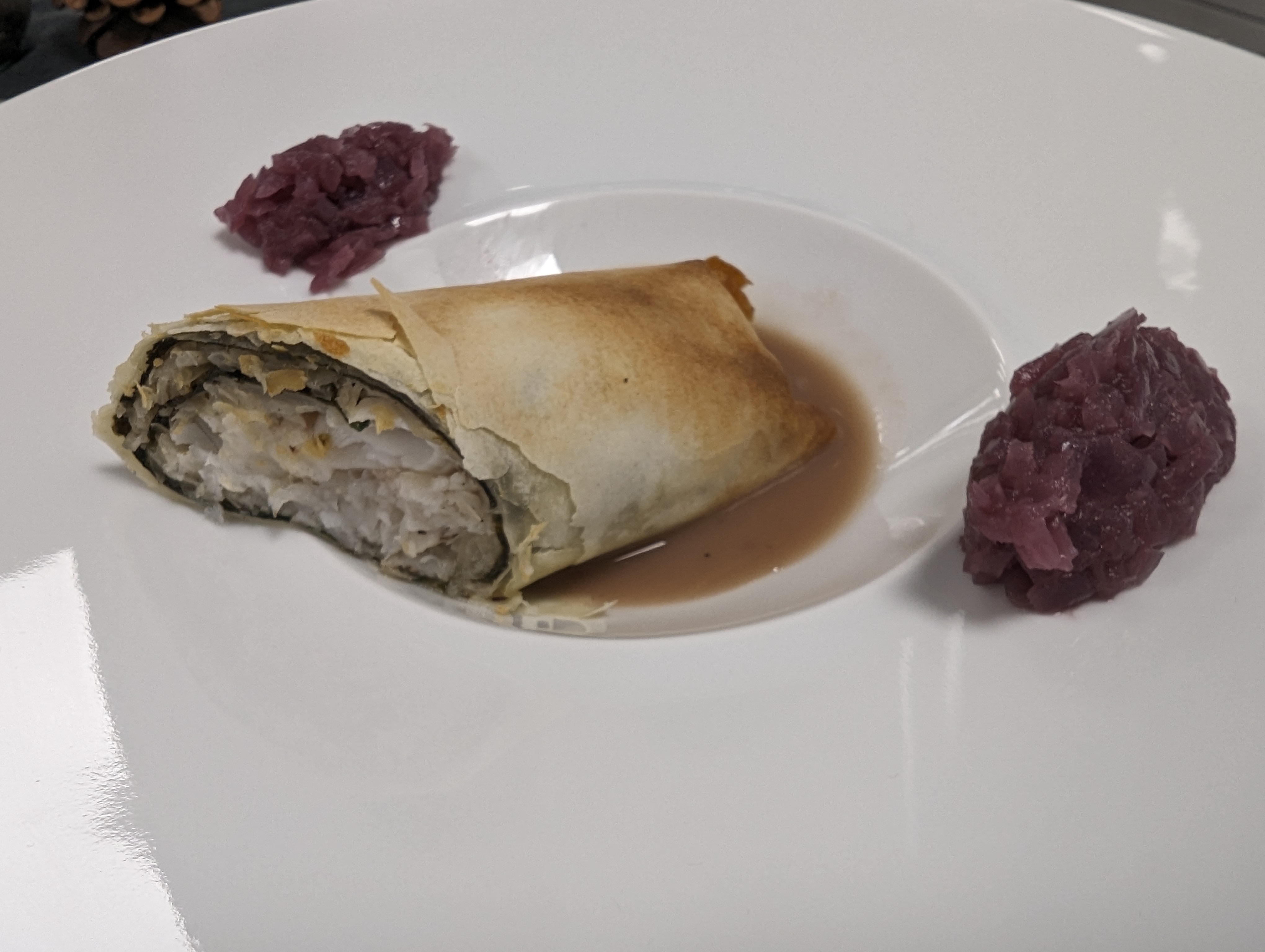 • Sauerkraut-Zander-Strudel mit Buerre blanc