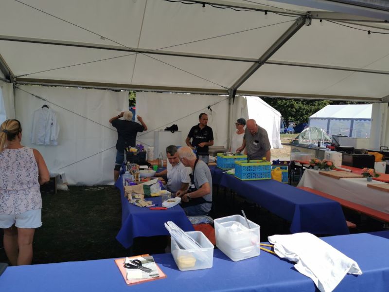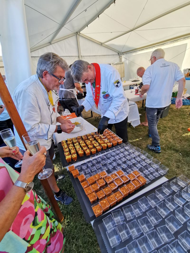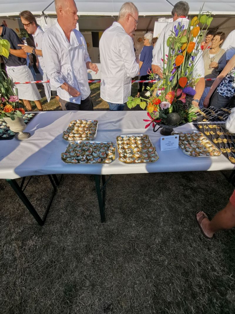 Unser Beitrag zum Fest, bestand aus dem Hauptgang „Surf & Turf“. Hierzu gatten wir ca. 9 kg Rinderfilet portioniert, gebunden, Sous vide gegart und Anschließend als Teppanyaki gegrillt. Dazu gab es Garnelen, Kartoffel-Sellerie-Püree, Salatbeilage mit Himbeervinaigrette sowie eine Krustentiersauce mit Parmesan. Für diesen Gang erhielten wir mehrfach Lob, welches neben der perfekten Zubereitung meist die sehr gute Kombination der Aromen und der exzellenten Sauce beinhaltete. Auch wenn wir als Chuchi-Melle-Grönegau noch Verbesserungspotential bei der Optik sahen freute uns die positive Resonanz sehr.